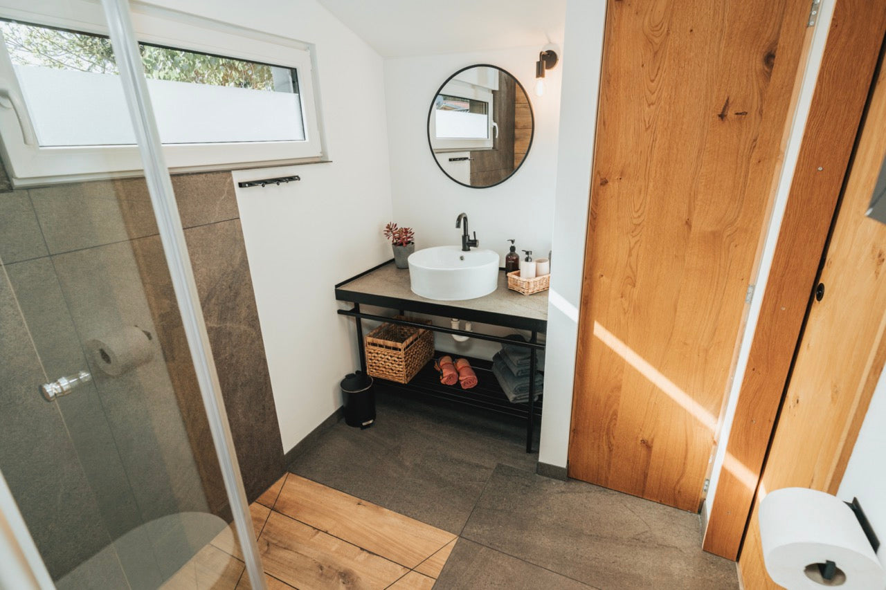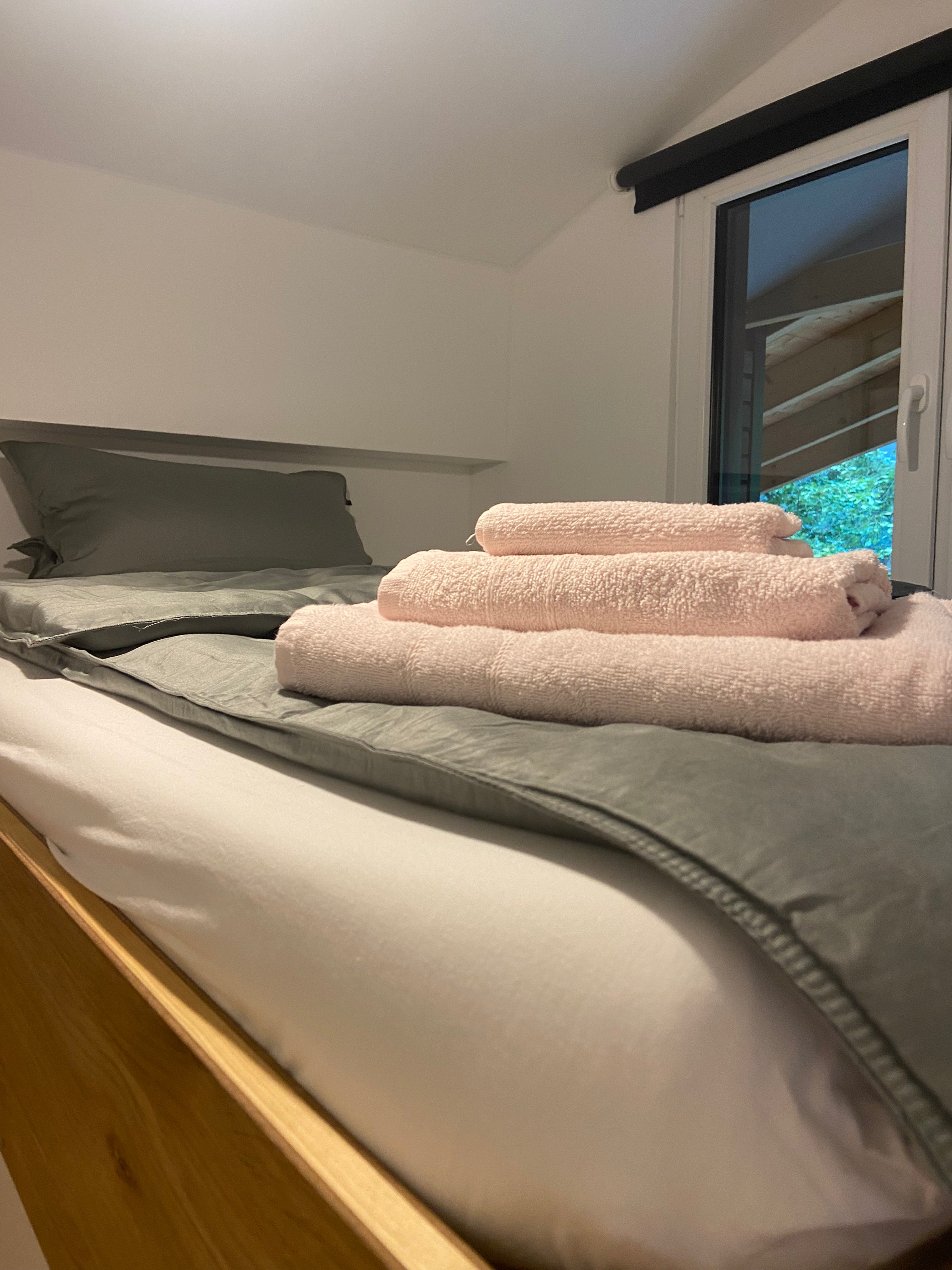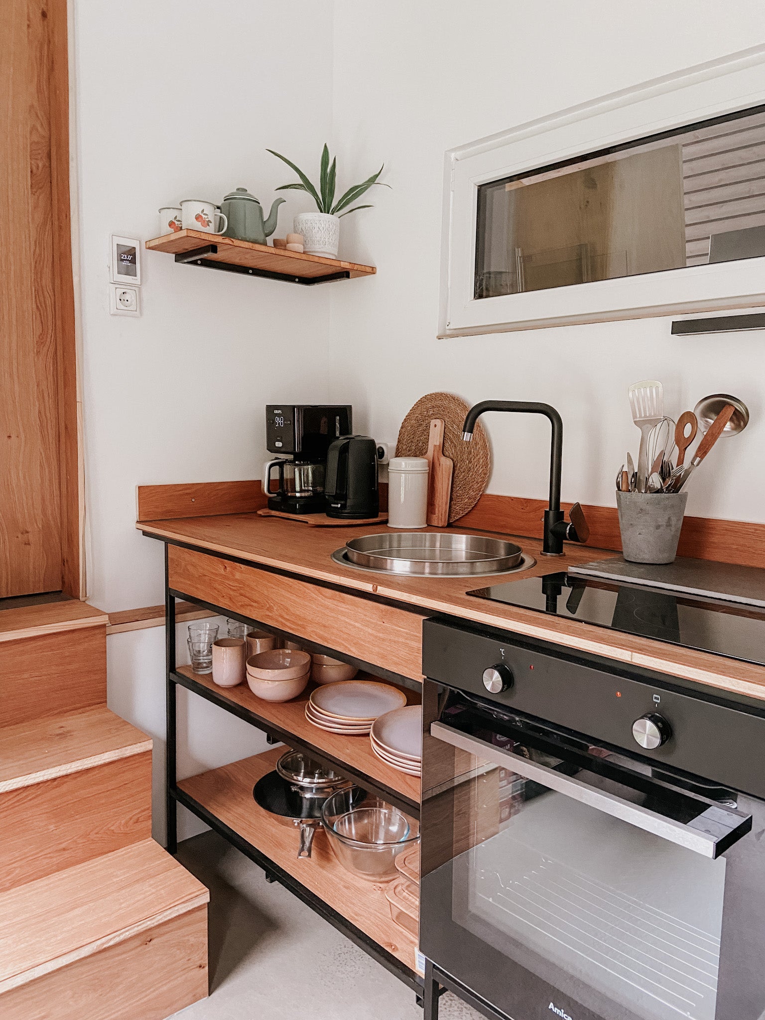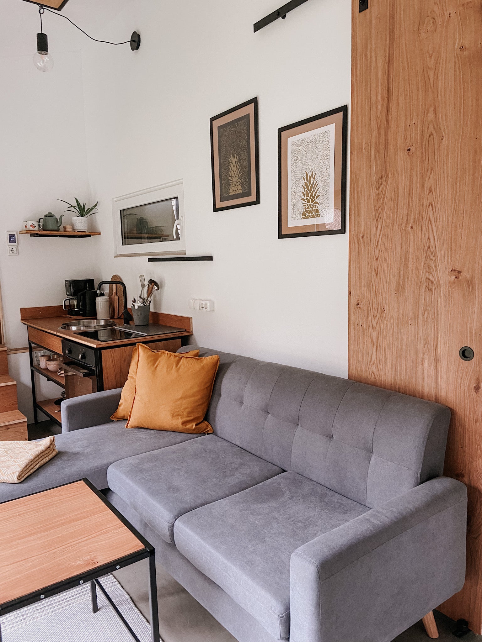 In unserem Ferienhäuschen BERTHA findest du einen gemütlichen Wohn- und Essbereich mit einer Couch, eine kleine Küchenzeile, ein Bad mit WC und Dusche sowie zwei Schlafbereiche (ein "ebenerdiges" Schlafzimmer, eine Schlafempore). Für ein wenig Zeit im Freien lädt die private Terrasse neben dem Ferienhäuschen ein. Unsere Bertha ist für maximal vier Personen ausgelegt.