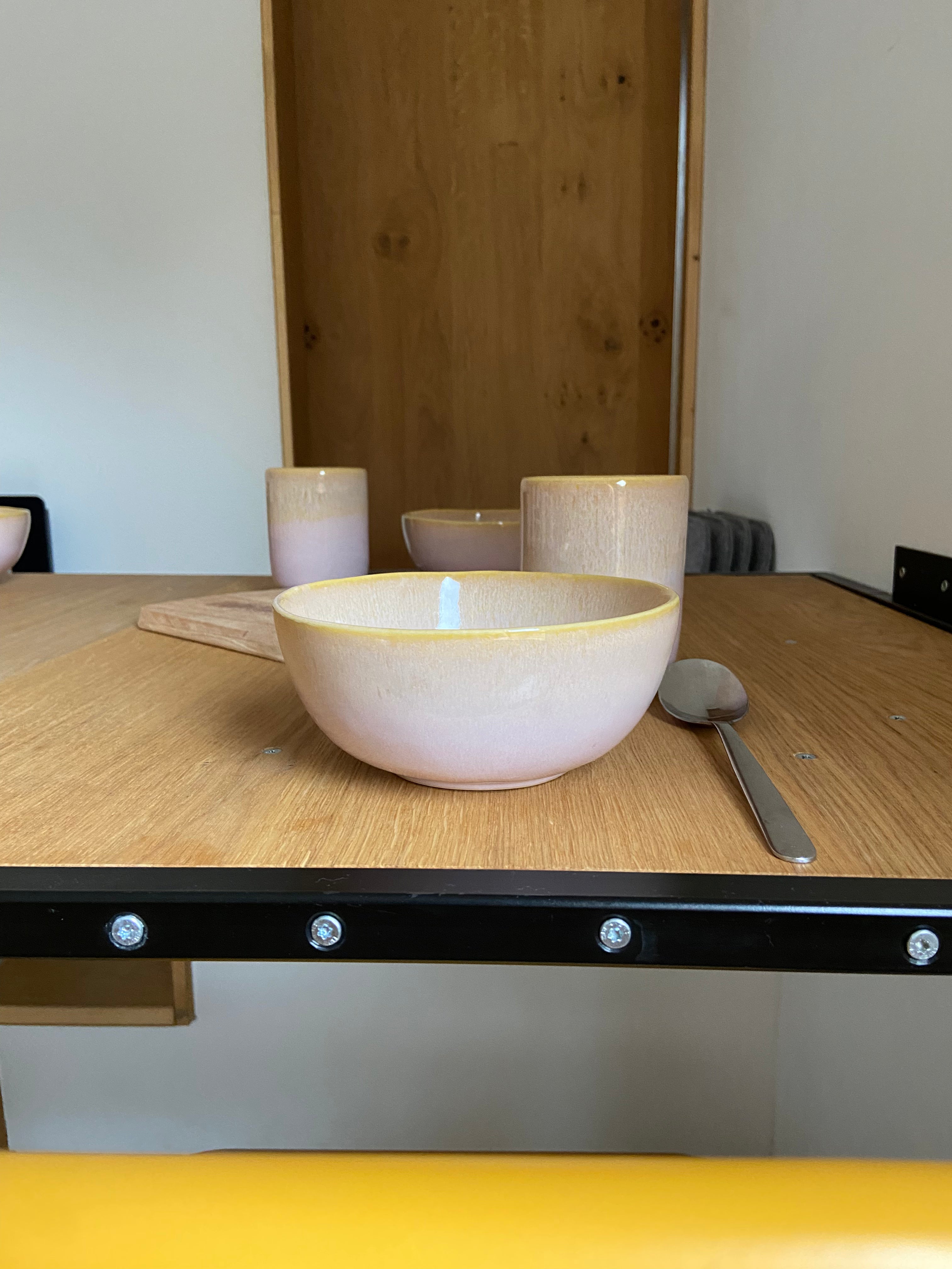 Geschirr und Besteck für 4 Personen | Kühlschrank, Herd, Ofen | Filterkaffeemaschine | Wasserkocher